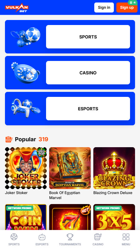 If you are a player who fancies sports betting, you will be happy with VulkanBet’s selection. The operator covers over 20 sports, including popular ones in our country, like ice hockey, football, basketball, boxing, American football and futsal. There is also a tab for e-sports on the site’s main menu, with games like DOTA 2, League of Legends and Counter Strike Global Offensive Available.