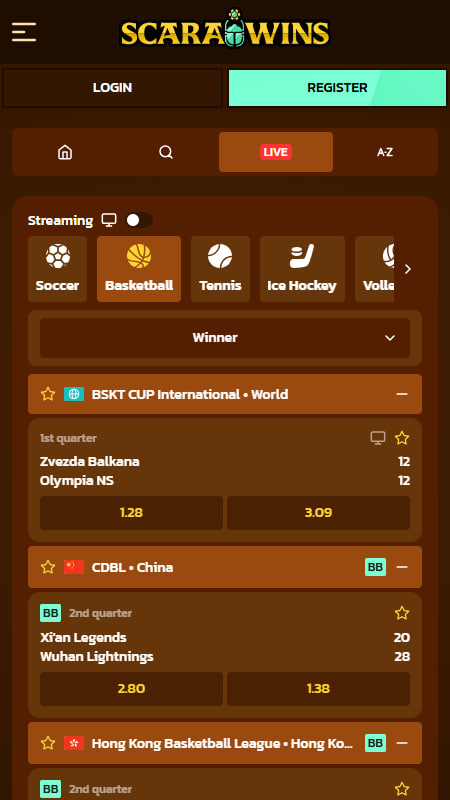 As mentioned, some live events are already shown on the Sports homepage by default. For the full list, click Live Betting just below the Scarawins logo. It operates the same way as pre-match betting, except the odds can change depending on how the match transpires. When we reviewed this section of the Sports page, we were disappointed to see less than 100 events that had open live betting markets. Football had the most events covered, at 25, followed by 17 for tennis and 11 for Basketball.