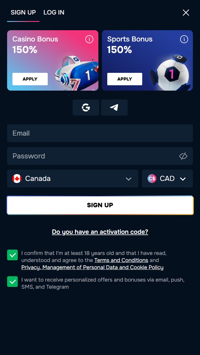Registration at Gizbo Casino