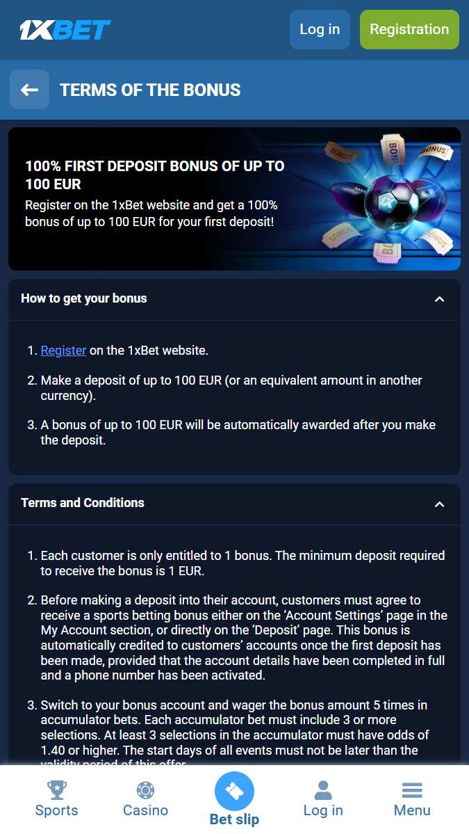 For sports lovers, 1xbet offers a 100% first deposit bonus of up to 100 EUR. To get this bonus, simply: